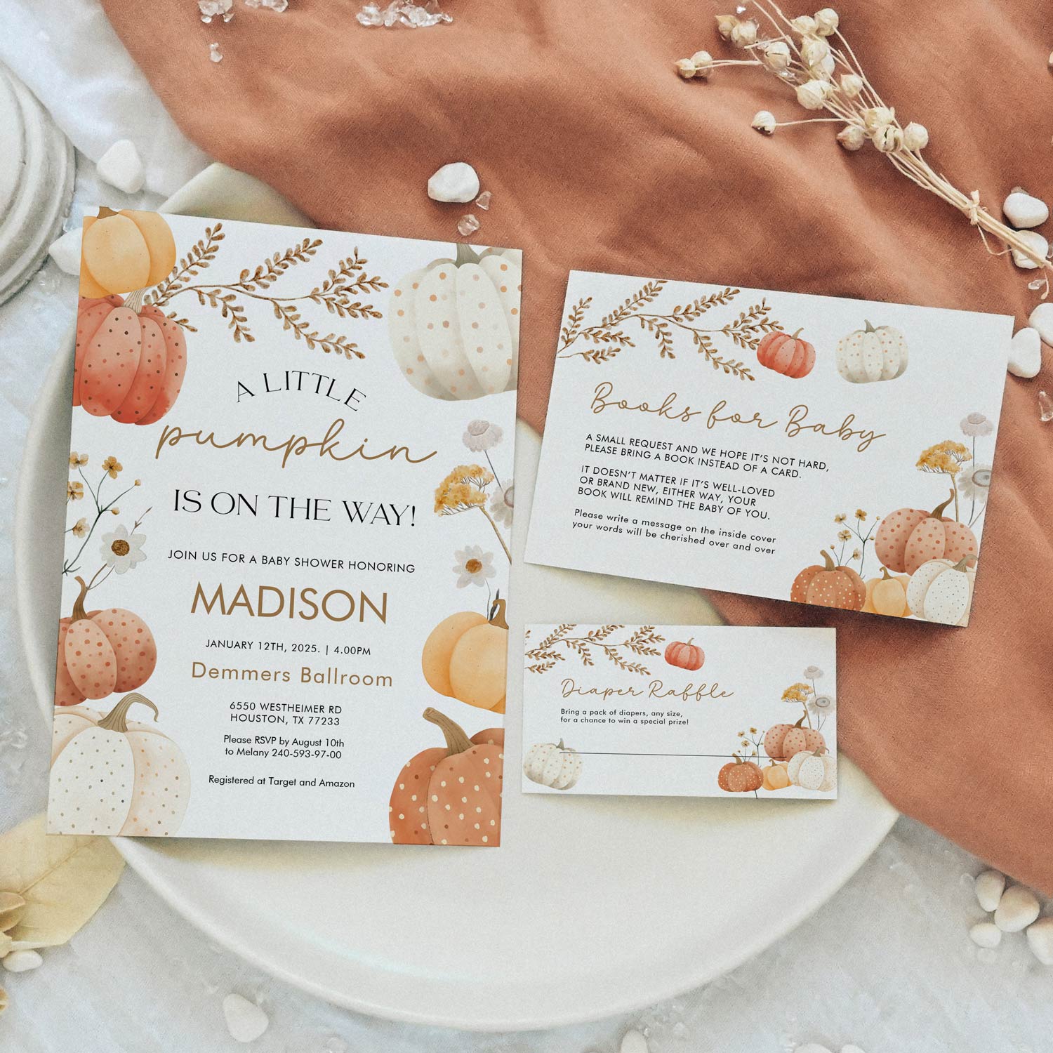 Don’t forget to coordinate your thank-you cards, diaper raffle tickets, and baby shower games with the same pumpkin design for a beautifully unified look. Your guests will love opening an invitation that feels warm, festive, and full of seasonal joy. So go ahead let that little pumpkin shine from the very first detail!