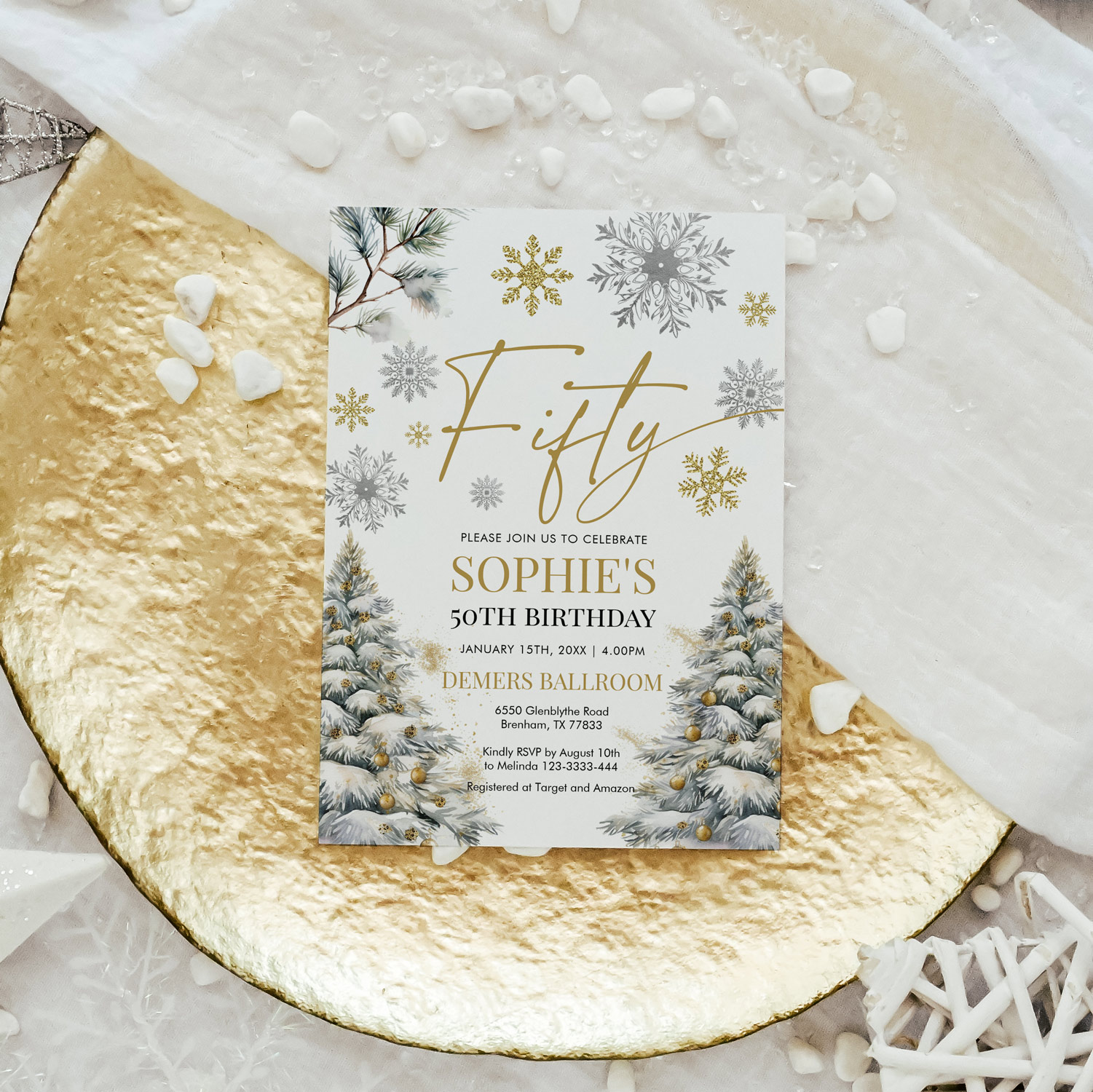 Make your celebration shine with a luxurious gold winter birthday invitation that’s truly one of a kind. Designed with snowy pine trees, glittering gold ornaments, and delicate snowflakes, this glamorous winter wonderland look instantly sets the stage for an unforgettable evening.